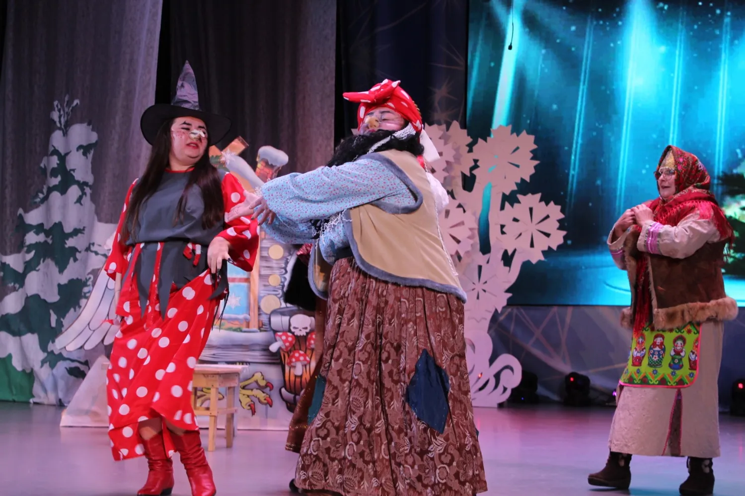 Отдав за билетик символическую цену в 200 рублей, прошла в зал. Здесь было немноголюдно. Стала разглядывать зрителей и увидела много знакомых лиц волонтеров из клуба «Золотой возраст» их родственников с детьми.Присела на кресло с фотоаппаратом и обратила внимание на сцену в ожидании действия. Она была сказочно красивой. Оформленная в снежно –голубых цветах, украшенная сцена создавала сказочную атмосферу. Вот избушка на курьих ножках и елочки лесные. Шумной гурьбой выкатились на сцену действующие герои. Баба-Яга, Мачеха с дочерью, Кикимора, Заяц с Лисой. Яркие костюмы актеров привлекали взгляды зрителей.