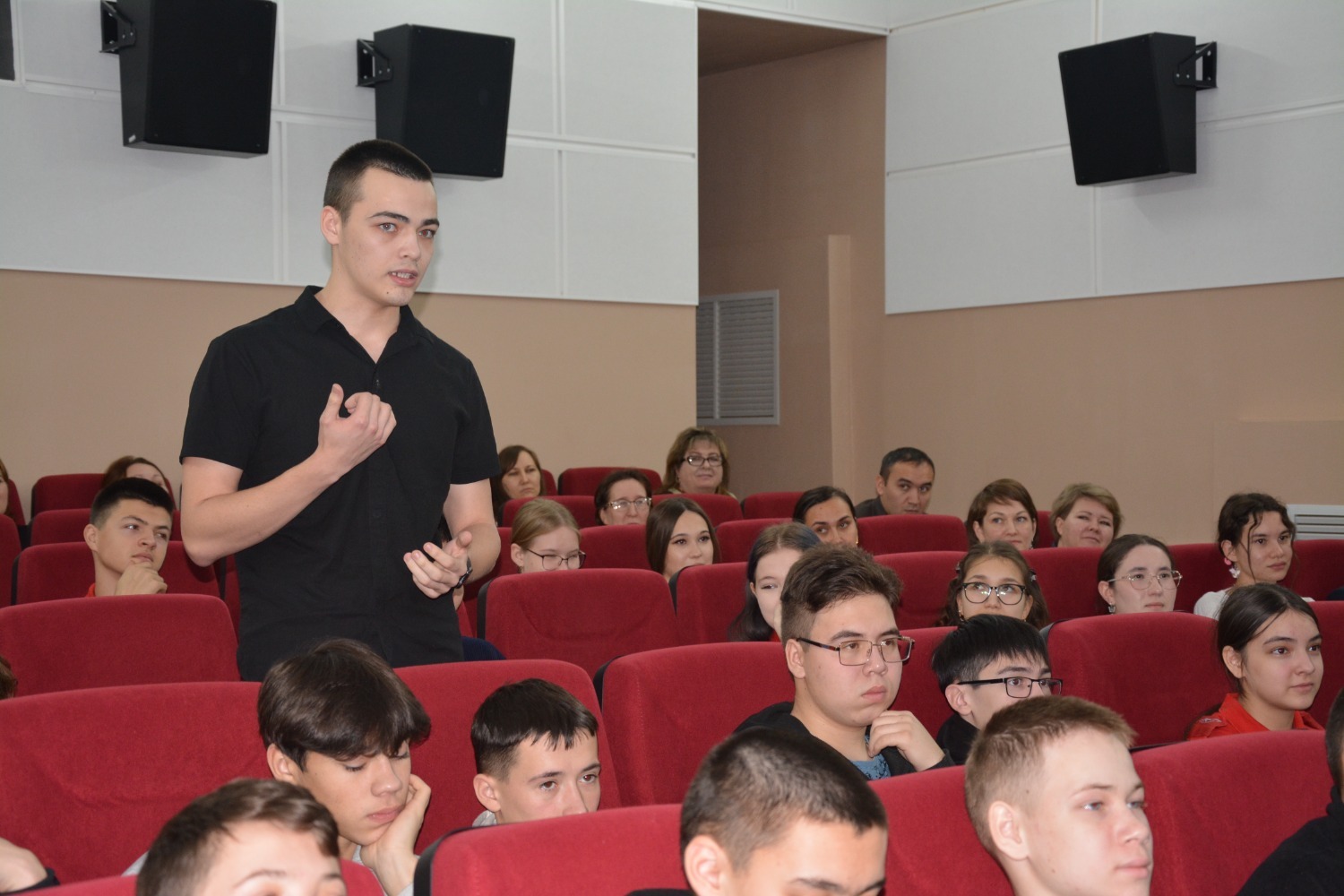 Вито Фладисович начал разговор с простого и живого знакомства. «Как настроение?» — спросил он у зала, вызвав дружные ответы. С помощью вопросов министр выяснил, кто в зале — школьники, студенты-аграрии или уже работающие специалисты. Он сразу дал свои контакты в социальных сетях, приглашая всех быть на связи и узнавать о конкурсах и грантах первыми.