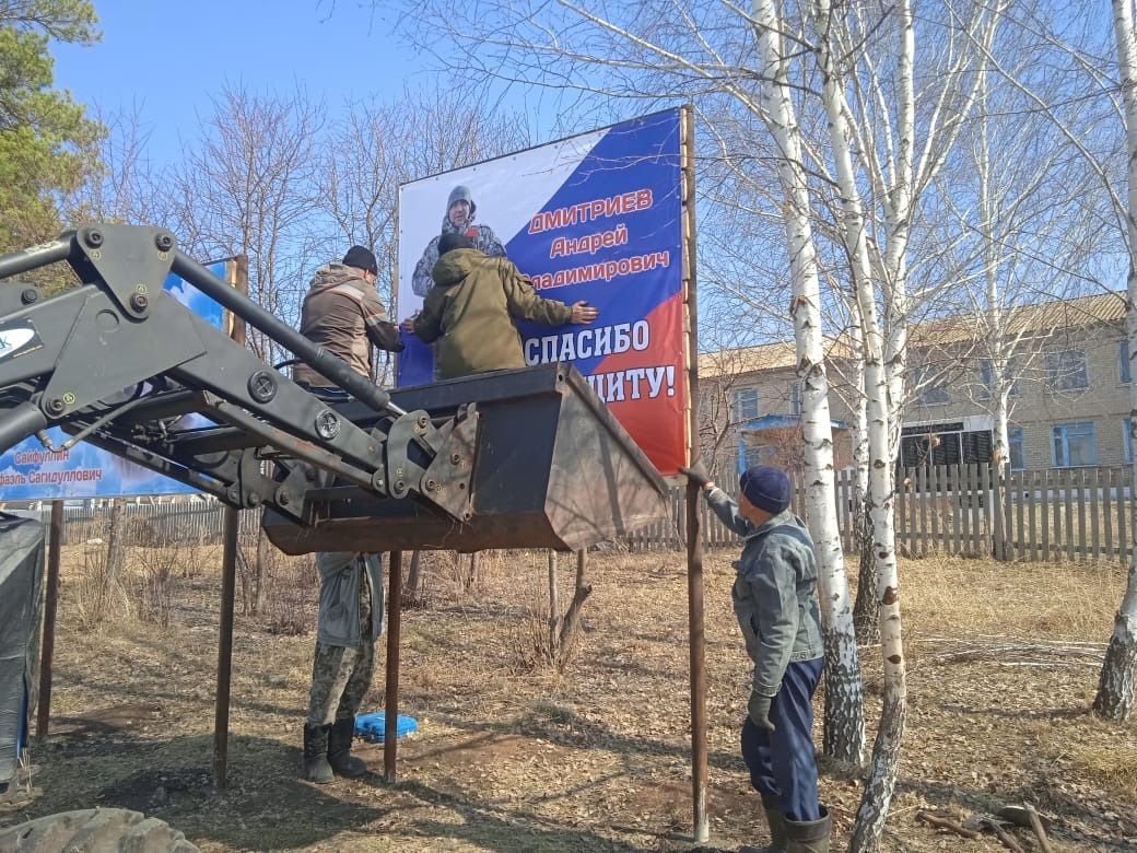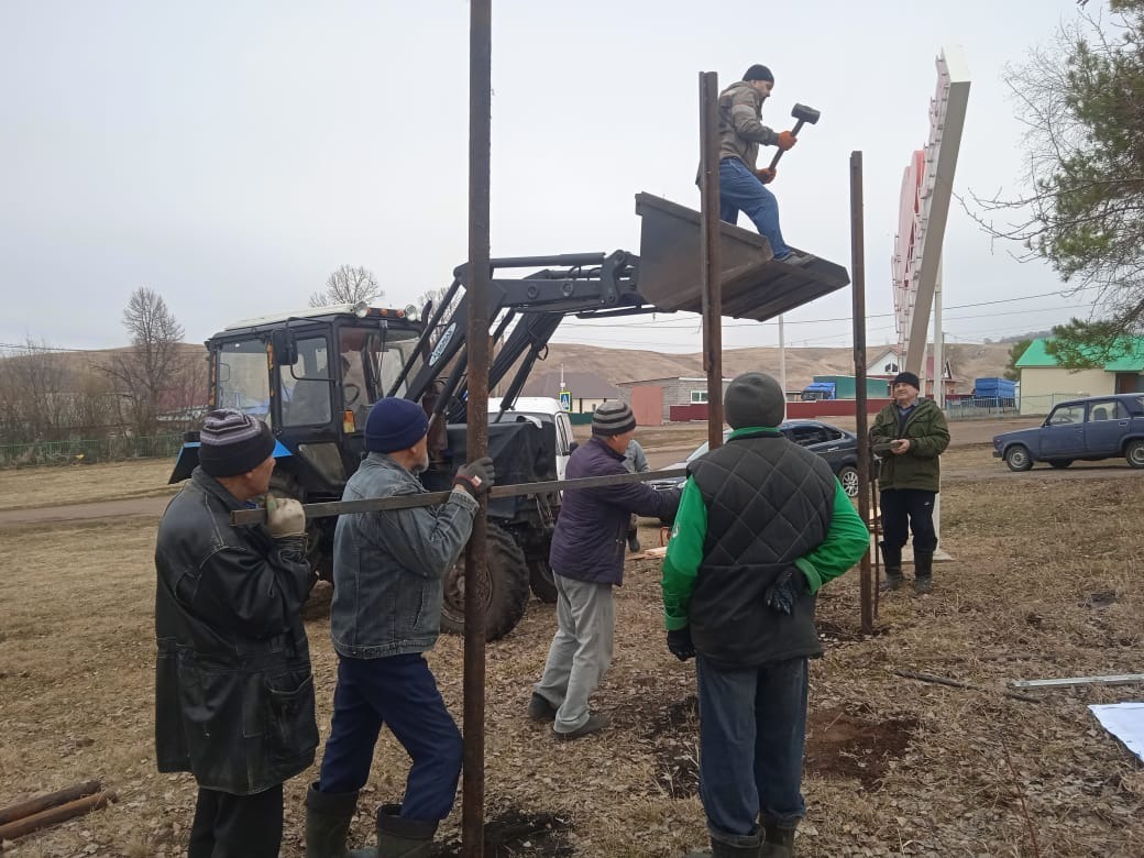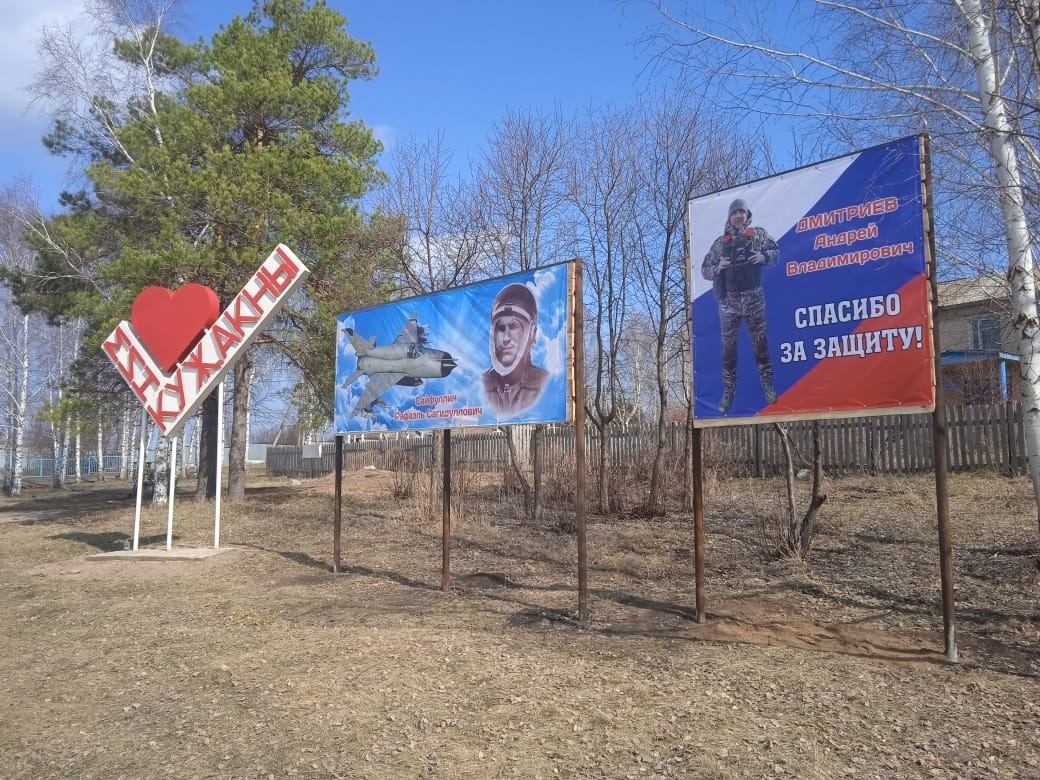 На площади перед школой теперь возвышаются два щита с изображениями славных сынов деревни – летчика-испытателя Рафаэля Сайфуллина и участника СВО Андрея Дмитриева. Эта идея вынашивалась у сельчан с прошлого года. Собрав денежные средства (около 25 тыс. руб.) и закупив все необходимое, ждали весны и схода снега. Главными спонсорами выступили Ильнар Кагарманов и Ильмир Насыров. Также в сборе приняли участие Ильдар Бикметов, Мансаф Асадуллин, Гульшат Сайфуллина (племянница летчика), Флорида Мухамадиярова, Резида Тимербулатова. Сварочными работами занимался Фаиль Файзуллин, доски привез Фанур Мухамадиев, а трубы – его брат Фануз. Подъемные работы проводились с помощью тракториста Ришата Лукманова. Участвовали в установке Фанис Тимербулатов, Мансаф Асадуллин, Рим Каюмов, Рифат Галиуллин, Ильдар Бикметов, Фарит Файзуллин, Альфир Камакаев, Фидан Латыпов, Айрат Кагарманов. К слову, осенью прошлого года кузяковцы собрали 50 тысяч рублей и установили стелу «Я люблю Кузяково». Именно рядом с этой новой достопримечательностью и памятником участникам ВОВ и появились портреты героев.