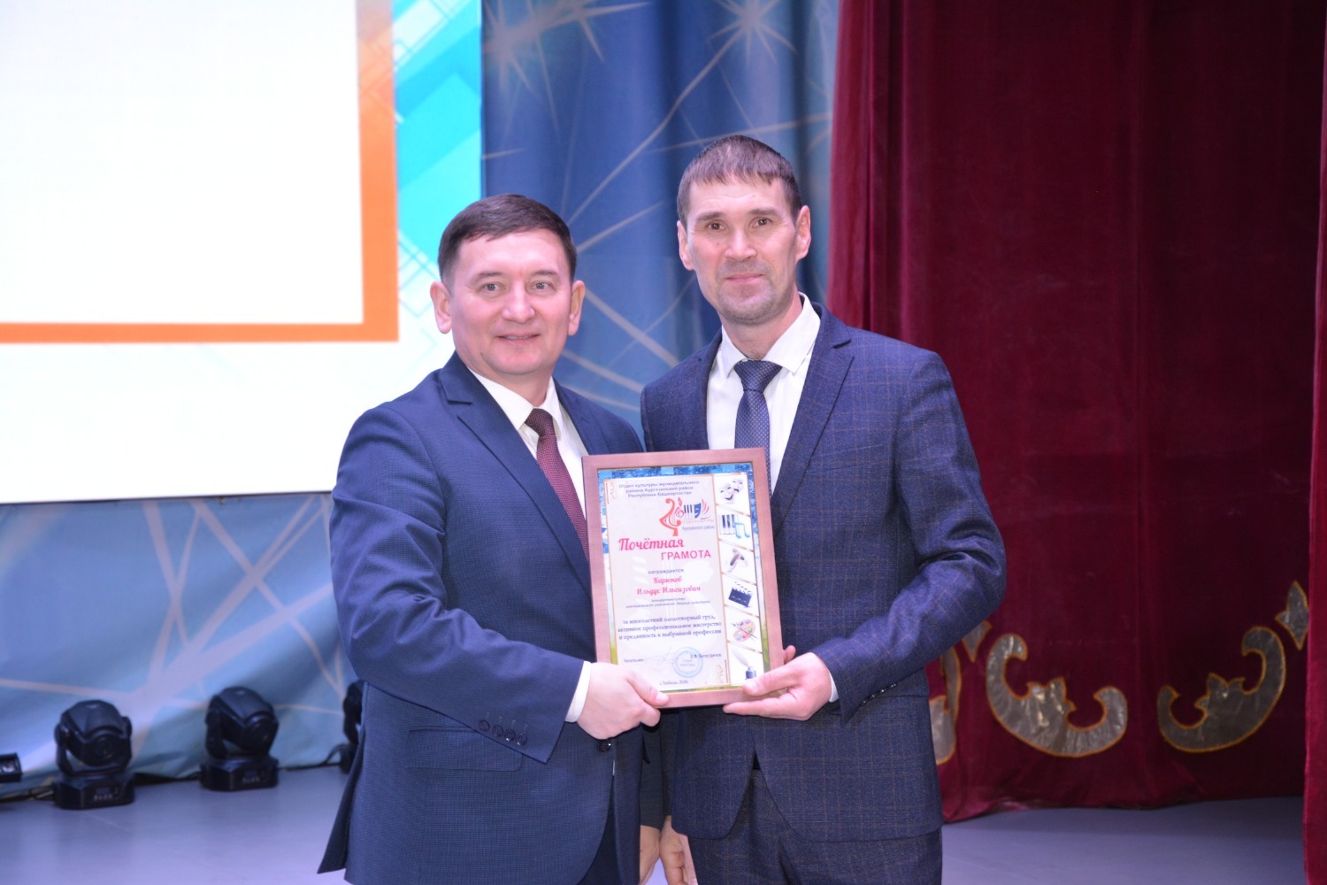 Карюков Ильдус Ильгизович – концертмейстер центрального районного дворца культуры – за многолетний плодотворный труд, активное профессиональное мастерство и преданность к выбранной профессии