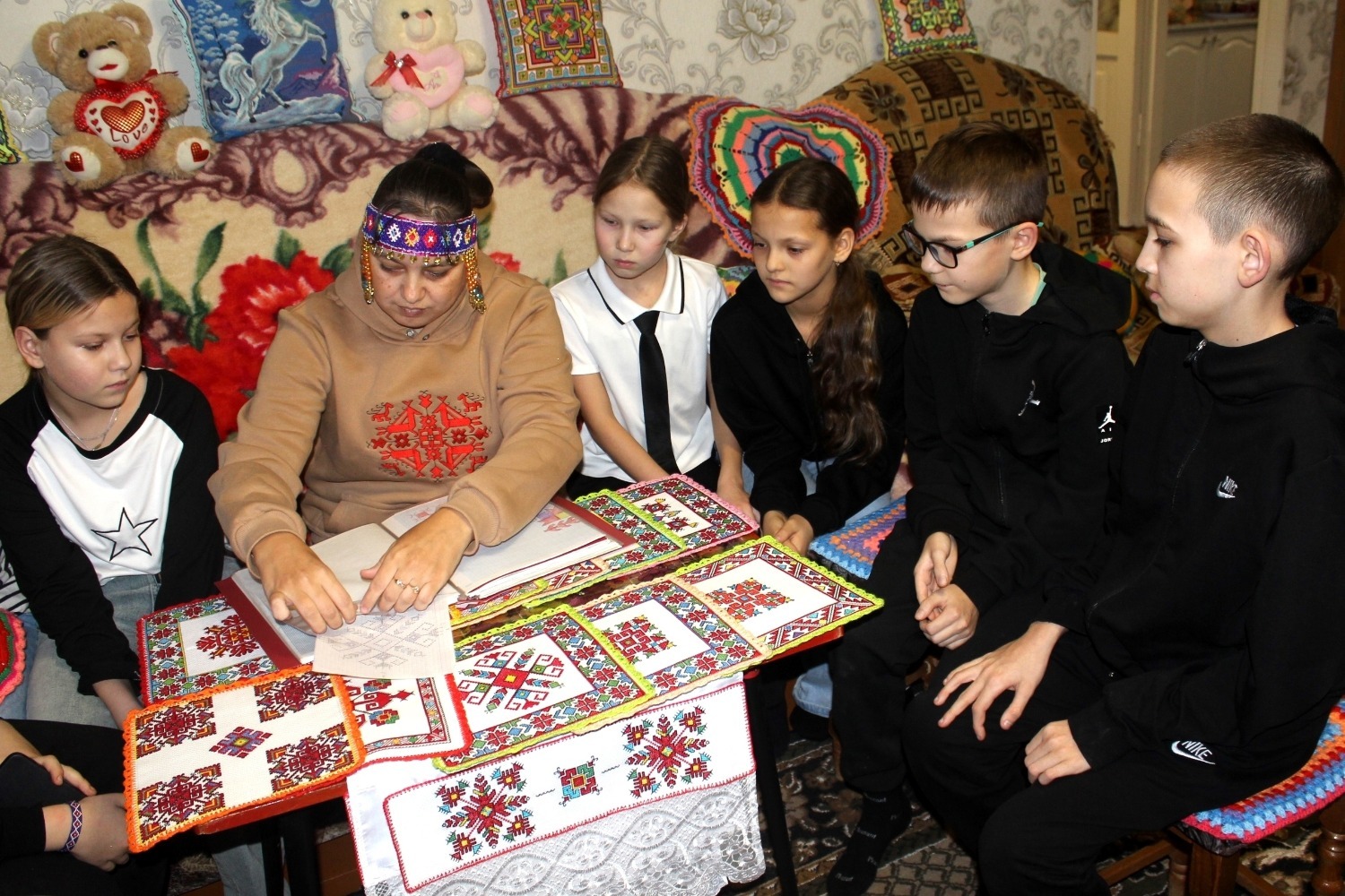 Ребята смогли увидеть, как именно девушка создает свои замечательные изделия, среди которых есть подушки, салфетки, полотенца, вышитые крестиком.
