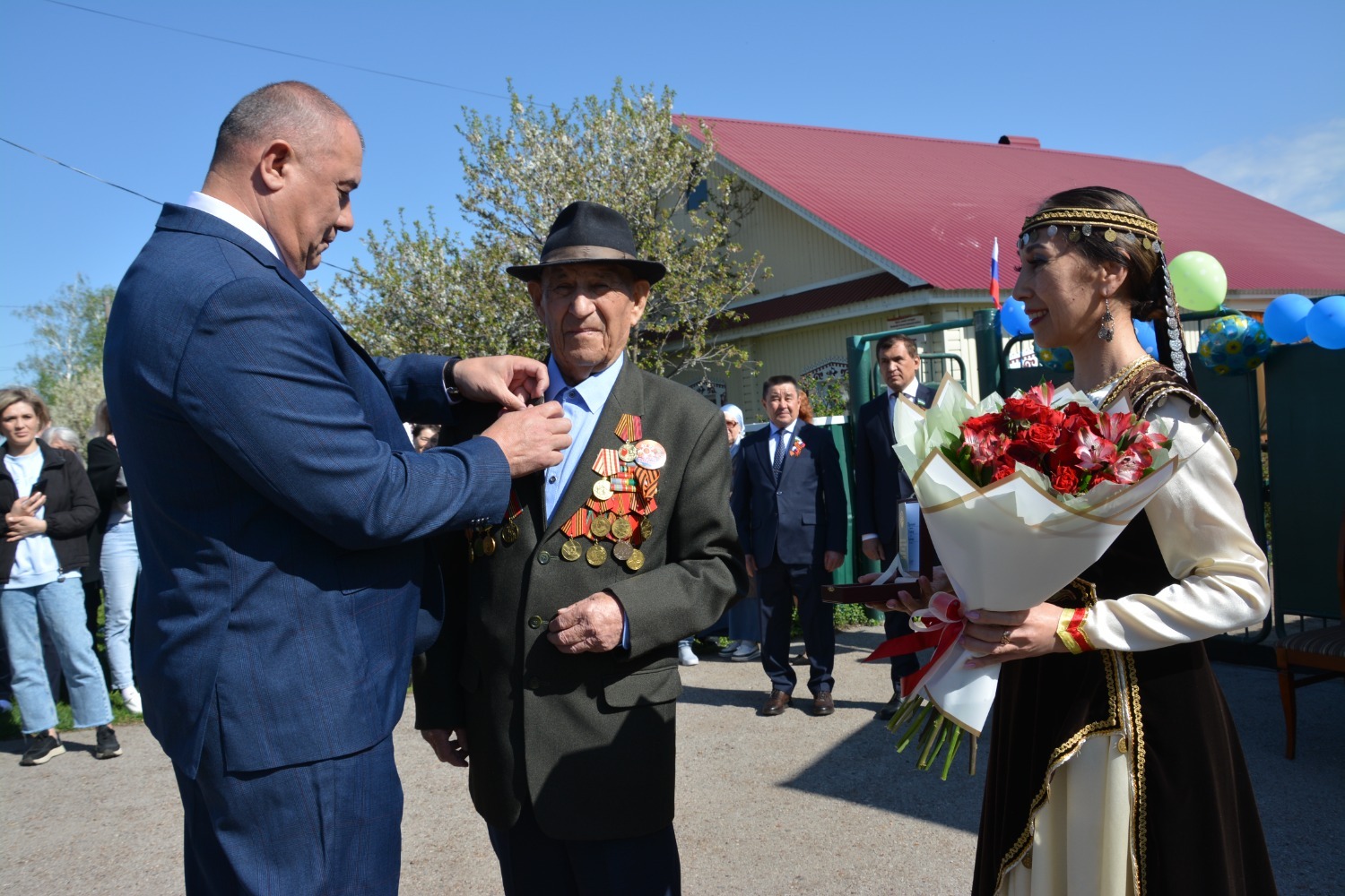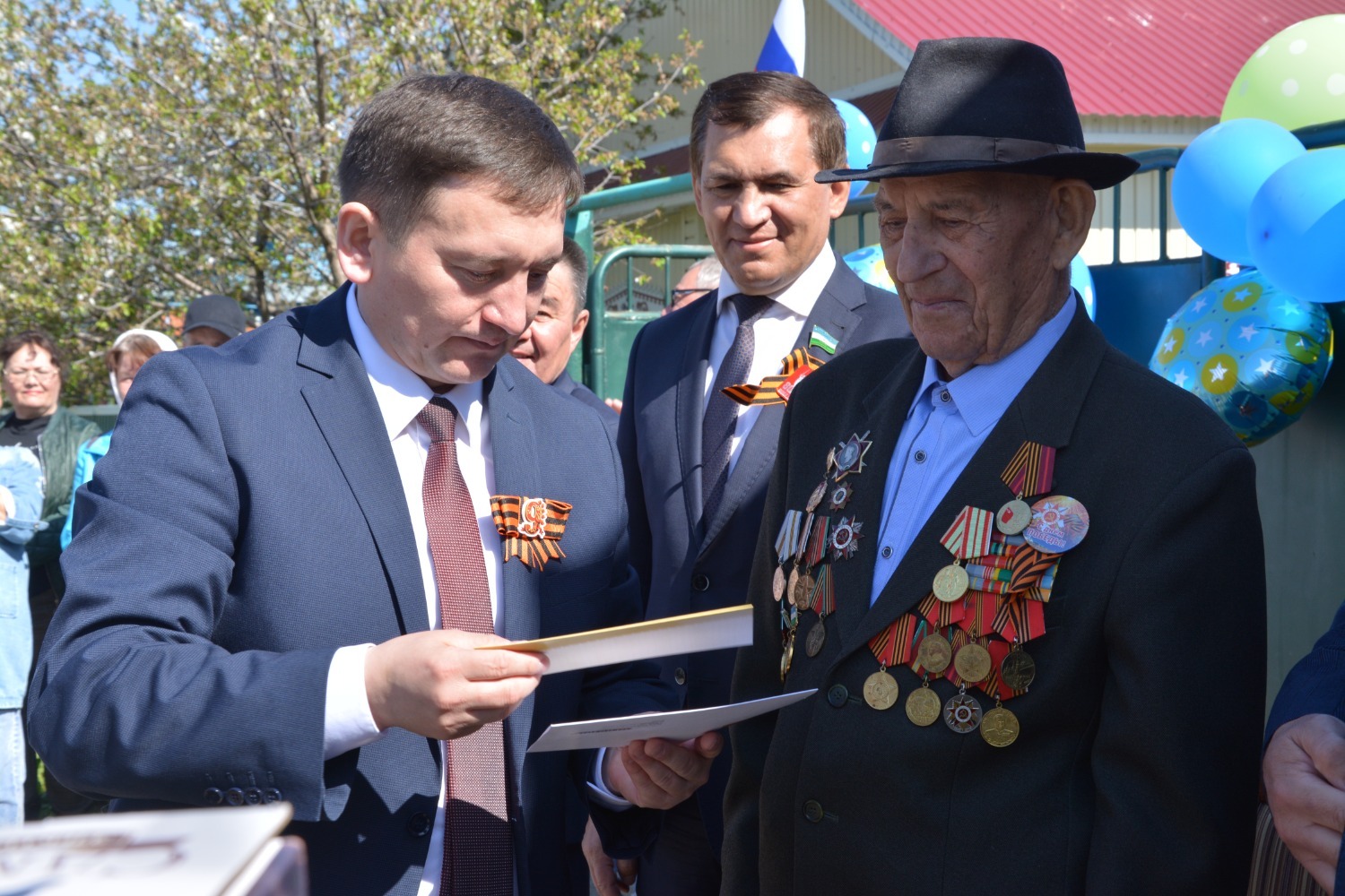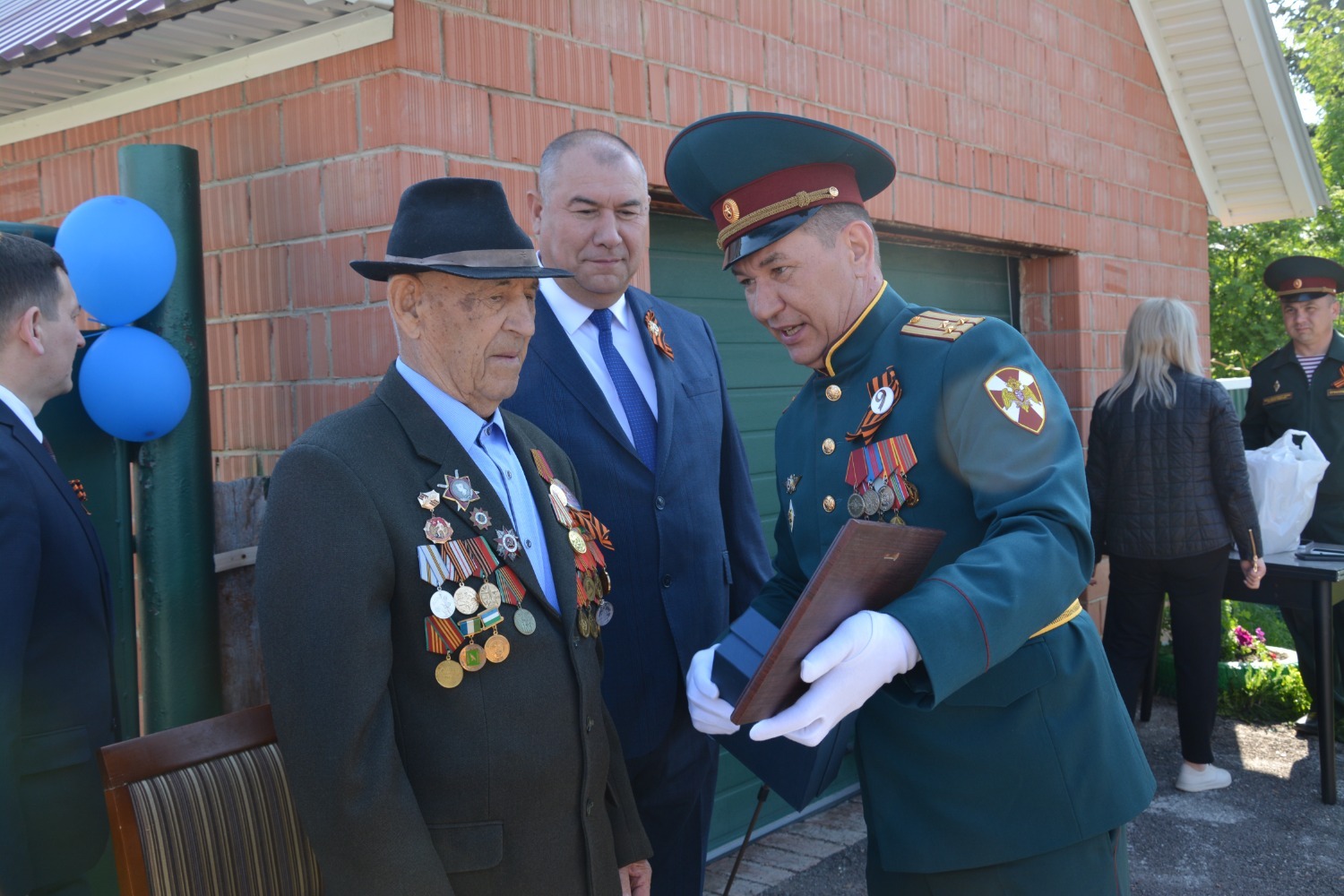 Юбилей ветерана собрал тех, кому дорога память о Победе. У ворот его дома выстроились: заместитель командующего Приволжским ордена Жукова округом войск Росгвардии по военно-политической работе полковник Вячеслав Морозов, заместитель премьер-министра республики Ирек Сагитов, депутаты Госсобрания-Курултая РБ Рамиль Бадретдинов и Загир Хакимов, глава администрации района Арслан Шагаетдинов.